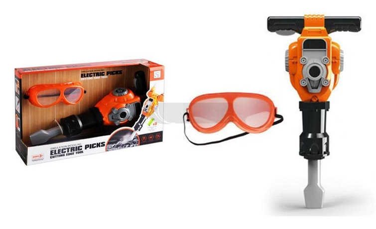 Zabawka młot pneumatyczny Electric Picks z efektami dźwiękowymi. W zestawie także okulary ochronne. Zabawka działa na baterie typu AA. Baterie nie są załączone do zabawki. Zabawka przeznaczona dla dzieci od lat 3. Produkt zapakowany w kartonowe pudełko. Podane wymiary są wymiarami opakowania.