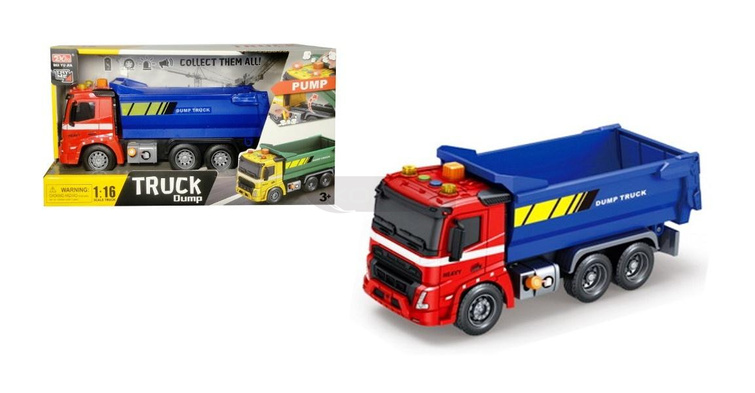 Zabawka ciężarówka wywrotka w skali 1:16. Model posiada ruchome elementy i funkcję pompowania. Auto świeci kolorowym światełkiem i wydaje dźwięki klaksonu, prac budowlanych. Produkt działa na baterie typu AG13. Baterie znajdują się w zabawce. Produkt zapakowany w kartonowe pudełko. Zabawka przeznaczona dla dzieci od lat 3. Podane wymiary są wymiarami opakowania.