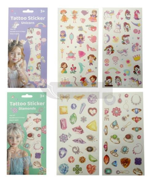 Tatuaże dla dzieci to tymczasowe, bezpieczne ozdoby naklejane na skórę. Są popularne na urodzinach. Te kolorowe tatuaże mają różne motywy: biżuterii i jednorożców. Produkt występuje w kilku wersjach kolorystycznych, wybierany losowo. Cena dotyczy jednej sztuki. Podane wymiary są wymiarami opakowania.