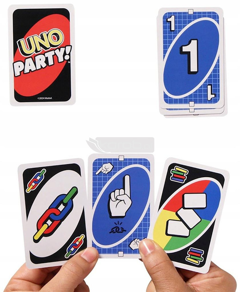 Karty UNO Party Imprezowa, towarzyska gra karciana, talia i reguły specjalne dla dużych grup, na wieczór gier, dla dzieci, dorosłych, rodzin i przyjaciół, od 6 do 14 graczy od 7 roku życia. Zbierz wszystkich do rozgrywki UNO Party! Gra się tak samo, jak w klasyczną grę UNO, ale ta wersja posiada specjalne karty i reguły stworzone z myślą o większych grupach, aby rozruszać każdą imprezę! Podobnie jak w klasycznej wersji dopasowujecie karty kolorem lub cyfrą, ale macie o wiele więcej kart. Do gry może dołączyć aż 14 osób, więc atmosfera rozgrzeje się do czerwoności! W tej wersji są reguły nakazujące graczom przekazywanie sobie kart do momentu, aż ktoś nie będzie mógł dalej grać, pozwalające wskazywać, kto ma dobrać karty, i łączące w parę graczy, którzy muszą jednocześnie dobrać karty. Jest nawet reguła Szybka rozgrywka! Przeznaczona dla 6–14 graczy od 7 roku życia ta towarzyska gra karciana UNO Party świetnie sprawdza się na wieczór gier z rodziną lub przyjaciółmi. Rozgrywka UNO Party jest podobna jak w klasycznej wersji UNO, ale reguły specjalne pozwalają grać większej grupie: od 6 do 14 graczy! "Szybka rozgrywka” pozwala graczowi wyłożyć kartę poza jego kolejką, jeśli jest wystarczająco szybki! Dzika karta „Dwie osoby biorą karty” zmusza 2 graczy do dobierania kart w tym samym czasie. Dzika karta „Weź stos” sprawia, że gracze wykładają karty w danym kolorze aż do momentu, gdy jeden z nich nie ma już pasujących kart i musi wziąć je wszystkie! Karta „Wskaż gracza dobierającego” nakazuje wszystkim graczom wskazać inne osoby i każdy dobiera tyle kart, ilu graczy na niego wskazało. UNO Party to świetna imprezowa gra towarzyska na przyjęcia i dla dużych grup, więc będzie doskonałym prezentem dla gospodarzy domowych imprez. Rozruszaj każde przyjęcie z grą UNO Party!