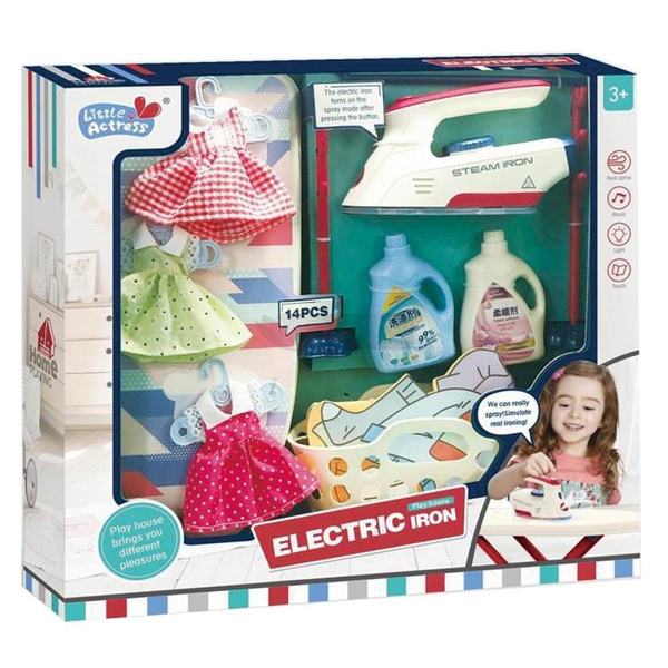 W zestawie deska do prasowania, żelazko, wieszak na ubrania, sukienki, kosz na pranie, butelki płynów do prania