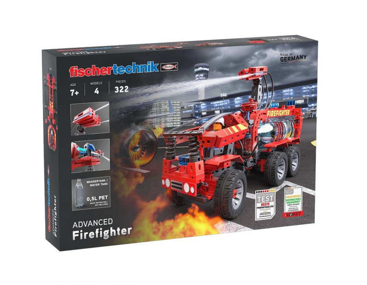 W zestawie znajduje się adapter do podłączenia standardowej butelki PET (0,5l), która wbudowana w model służy jako zbiornik na wodę. W ten sposób dzieci mogą poznać, że przedmioty codziennego użytku mają wiele różnych zastosowań i uświadomić sobie znaczenie zrównoważonego rozwoju. Ciśnienie w wypełnionej wodą plastikowej butelce podnosi się za pomocą pompki, dzięki czemu po otwarciu zaworu z dołączonego węża strażackiego efektownie tryska woda. Dzięki dołączonemu ludzikowi fischertechnik dzieci mogą identyfikować się ze strażakiem i przeżywać wiele ekscytujących przygód wyruszając na ekscytujące misje, gasząc pożary i ratując ludzi.
