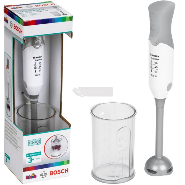 KL 9246 Blender Bosch z pojemnikiem srebrny Blender Klein powstał na licencji Bosch, dlatego też są wierną kopią prawdziwego urządzenia produkowanego przez tę firmę. Firma Klein od lat produkuje odpowiedniki prawdziwych narzędzi i akcesoriów AGD, przeznaczone do zabawy dla najmłodszych. Zestaw składa się z ręcznego blendera oraz przezroczystego pojemnika z miarką (250 ml). Blender jest kopią urządzenia marki Bosch i jak cała seria urządzeń AGD jest w kolorze srebrnym. Końcówka blendera obraca się po naciśnięciu guzika, a jego nasadkę mieszającą można zdjąć, co nadaje zabawie jeszcze większego realizmu. Ważną zaletą zabawki jest nie tylko jej pełna funkcjonalność, ale również gwarancja bezpieczeństwa, gdyż wszystkie elementy zostały wykonane z plastiku. Materiały, są najwyższej jakości, a także bezpieczne dla dziecka. Zabawka pozwoli każdemu dziecku na naśladowanie rodziców w sposób bezpieczny i pełen dobrej zabawy. Wielkość wszystkich elementów i akcesoriów zestawu jest dopasowana do potrzeb i rączek dziecka. Zabawka z pewnością będzie również świetnym uzupełnieniem pozostałych zestawów kuchennych firmy Klein. Specyfikacja: Produkt jest zabawką Zabawka przeznaczona dla dzieci powyżej 3 roku życia Waga : 0,3 kg Wymiary opakowania : 8x8x27 cm Ilość w opakowaniu zbiorczym : 6 Kraj pochodzenia : Chiny Seria zabawek AGD firmy KLEIN realistycznie odzwierciedla prawdziwe urządzenia wprowadzone na rynek przez najbardziej znane i jakościowo najlepsze marki produktów. Dla małych gospodyń domowych to niesamowita atrakcja! Dzieci z chęcią uczą się pomagać w wykonywaniu domowych czynności jednocześnie świetnie się przy tym bawiąc. Każdy ze sprzętów kuchennych pomoże w przygotowaniu zarówno małej przekąski jak i wykwintnego przyjęcia dla lalek lub koleżanek. Dodatkową zaletą tych zabawek jest to, że ich kolorystyka jest odpowiednia dla dziewczynek oraz dla chłopców.