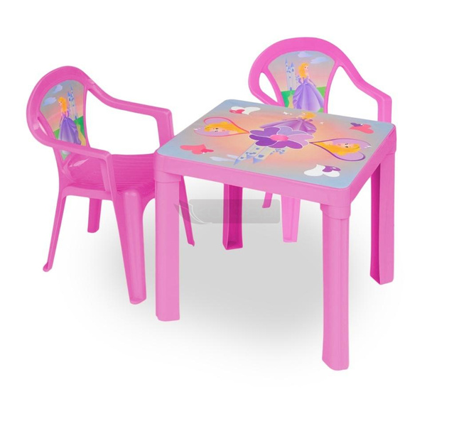 Zestaw: stolik i dwa krzesła, kolor Różowy, wtopiona etykieta IML z kolorowym motywem w blat stolika i oparcie krzesła uniemożliwa jego odklejenie i gwarantuje wysoką odporność na warunki atmosferyczne, do stosowania zarówno na zewnątrz, jak i wewnątrz