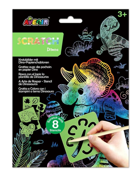 Avenir Scratch to zupełnie nowe podejście do prac ręcznych. Wyjątkowy arkusz, na którym tworzy się poprzez zdrapywanie warstwy wierzchniej, by odsłonić wielobarwną warstwę spodnią. Zdrap 2 magiczne arkusze dinozaurów, korzystając z 8 szablonów z motywami dinozaurów. Do zestawu dołaczony również patyczek do zdrapywania oraz szmatka do wycierania.