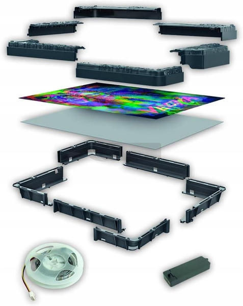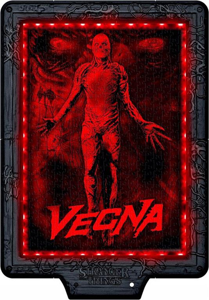 Oglądanie Stranger Things w ciemności, z obrazem, który zmienia się wraz ze zmianą światła LED, to wyjątkowe doświadczenie, pozwalające przenieść się w odwrotną atmosferę. Produkt zawiera: puzzle 520 elementów (49 x 36 cm), twardą tekturę, woreczek z klejem, ramkę montażową, moduł elektroniczny, pasek LED RGB, plakat informacyjny i instrukcję obsługi. Po włączeniu światła obraz jest nałożony na siebie w 3 poziomach kolorów. Po wyłączeniu światła i włączeniu diody LED zobaczysz obraz odpowiadający kolorowi diody LED. Złóż puzzle, złóż ramkę, wyłącz światło i włącz diodę LED, aby przeżyć to doświadczenie.