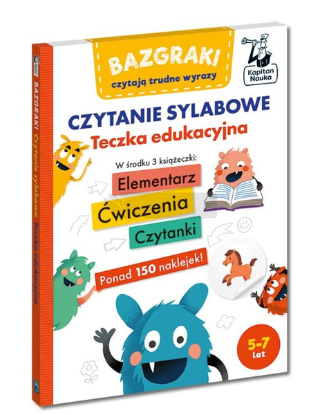 Bazgraki czytają trudne wyrazy. Czytanie sylabowe. Teczka edukacyjna zawiera kompletny zestaw materiałów do nauki płynnego czytania metodą sylabową dla dzieci w wieku od 5 do 7 lat, które znają już wszystkie literki i mają już za sobą pierwsze próby czytania sylabami. Przedszkolak może korzystać z 3 książeczek równolegle, dzięki czemu będzie miał szeroki wybór ćwiczeń i możliwość łatwego dopasowania ich do swoich bieżących potrzeb. Łącznie to aż prawie 100 stron pełnych łamigłówek oraz ponad 150 kolorowych naklejek!