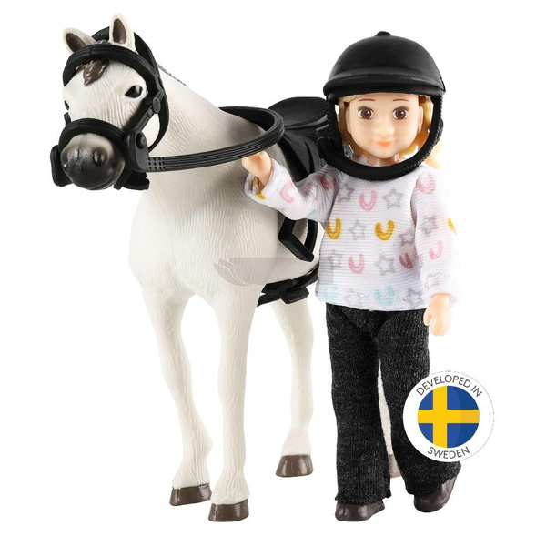 Zabawka zawiera uroczą lalkę, która jest pasjonatką jazdy konnej i jej konia. Piękny biały koń może być osiodłany załączonym czarnym siodłem, jest również uzda i kask jeździecki.