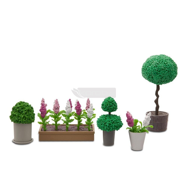 Udekoruj wnętrza swojego domku dla lalek szwedzkiej marki Lundby za pomocą cudownego zestawu kwitnących kwiatów i fantazyjnych roślin doniczkowych. Komplet zawiera kuliste drzewko, małe drzewko w stylu bonsai, roślinkę krzewiastą oraz kwitnące kwiaty, które można zrywać i wazon do ich ekspozycji.