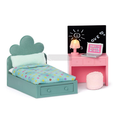 Zestaw mebli i akcesoriów do młodzieżowego pokoju w domku dla lalek zawiera wygodne zielone łóżko z fantazyjnym zagłówkiem, otwieraną szufladą i kompletem pasującej pościeli, futrzany bladoróżowy puf, różowe biurko, laptop, tablicową ściankę z radosną twórczością i lampkę LED, która oświetla pokój i stwarza odpowiedni nastrój. Lampka ma wbudowany timer i wyłącza się automatycznie po 15 minutach.