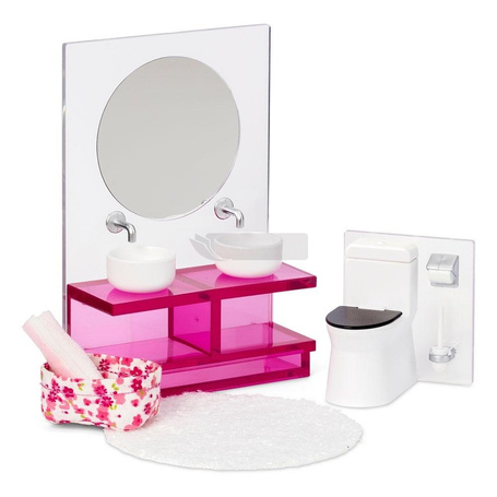 W komplecie łazienkowym znajduje się toaleta z podnoszoną klapą, papierem toaletowym i szczotką do czyszczenia. Jest również zabudowa w energetyzującym kolorze fuksji z dwiema umywalkami, kranikami i półkami, nad którą wisi nowoczesne okrągłe lustro. W załączonym koszyczku z pasującym do całości różowym wzorem kwiatowym znajduje się ręcznik, a całości dopełnia mięciutki biały dywanik.