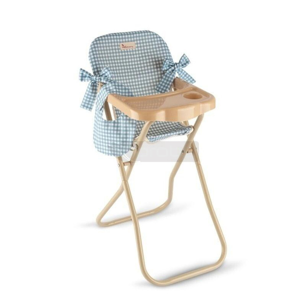 Krzesełko Noel dla lalki do 46 cm Asi 3712303 Jeśli Twoja pociecha uwielbia wcielać się w rolę troskliwej mamusi, to z pewnością zachwyci ją beżowo-niebieskie stylowe krzesełko do karmienia z popularnej kolekcji Asi Teresa 3712303. Najlepiej pasują do niego bobasy i klasyczne lalki hiszpańskie o wysokości do 46 cm. Dzięki wysokiej jakości wykonania i stabilności, mebelek o wysokości 60 cm jest bezpieczny, wygodny w użytkowaniu oraz trwały. Zaprojektowany z myślą o dzieciach w wieku od 3 lat, łączy w sobie funkcjonalność i oryginalny styl. Atrakcyjności zabawce dodaje bawełniany wiązany śliniaczek. Czym wyróżnia się krzesełko do karmienia Asi 3712303? Każda dziewczynka z radością będzie karmić ulubione lalki w krzesełku Asi 3712303. Zachwyca ono modnym wzorem w niebieską kratkę na jasnej bawełnianej tkaninie. Eleganckie kokardki dodają całości szyku. Solidne i stabilne metalowe elementy krzesełka są polakierowane na beżowo, dając w ten sposób efekt estetycznego piękna. Proste do złożenia krzesełko Asi Teresa 3712303 jest łatwe w przechowywaniu i transporcie. Zapakowane w przezroczysty foliowy woreczek. Zaskocz miłośniczkę lalek hiszpańskich krzesełkiem do karmienia o unikalnym designie! Akcesoria, odpowiednio dobrane do kolekcji lalek hiszpańskich, zapewniają niekończącą się, atrakcyjną zabawę, uczą troski i odpowiedzialności. Zachęć dziewczynkę do wcielania się w rolę małej opiekunki!