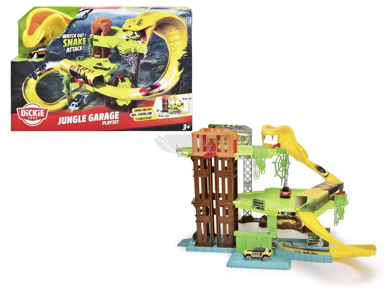 Garaż inspirowany dżunglą, zjeżdżalnia w kształcie kobry, ręczna winda, 3 poziomy, przełącznik do zmiany toru, dół z kwasem, w zestawie 1 metalowy pojazd. Wymiary: 50x55x32,5 cm, 3l+