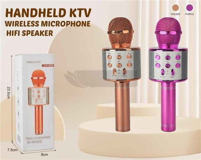 Przedstawiamy wszechstronny mikrofon bezprzewodowy KTV, który łączy funkcje mikrofonu, głośnika HiFi i urządzenia do karaoke w jednym. Ten model, widoczny na opakowaniu jako WS-858, gwarantuje doskonałą jakość dźwięku, idealną zarówno do śpiewania, jak i odtwarzania muzyki. Mikrofon posiada łatwy w obsłudze panel sterowania z przyciskami do regulacji głośności mikrofonu i muzyki (MIC VOL, VOL- VOL+), sterowania odtwarzaniem (PREV, NEXT, SCAN), nagrywania (REC) oraz efektu echa (REMIX). Dostępne są dwie atrakcyjne wersje kolorystyczne: elegancki złoty (miedziany) oraz żywy fioletowy (różowy), co pozwala dopasować go do własnego stylu. Wymiary opakowania to około 23,5 cm wysokości, 8 cm szerokości i 7,5 cm głębokości, co świadczy o jego kompaktowości i łatwości w przenoszeniu. To idealny gadżet na imprezy, spotkania rodzinne czy do domowego studia karaoke. Ciesz się muzyką i śpiewaj, gdziekolwiek zechcesz.