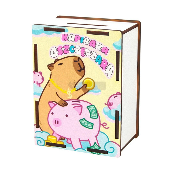 Drewniana, ekologiczna skarbonka z grafiką kapibary i napisem KAPIBARA OSZCZĘDZARA. Posiada specjalny otwór na górze do wrzucania monet i banknotów. Skarbonka CRESCO to świetny prezent, który uczy oszczędności młodego człowieka. Skarbonka nie zawiera zawartości, ale po zakupie jest od razu gotowa na przyjecie gotówki :)