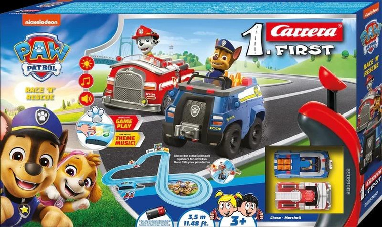 Na 3,5-metrowym torze Carrera FIRST z zestawu "PAW Patrol - Race 'N' Rescue" Chase i Marshall wyruszają razem na kolejną ekscytującą misję. Dzięki interaktywnym funkcjom zabawy, efektom świetlnym, dźwiękowym i muzycznym misja ratunkowa jest prawdziwą atrakcją dla małych bohaterów w wieku od 3 lat. Kolejka tematyczna z obrotowym blatem i ekscytującymi elementami zapewnia mnóstwo zabawy. Czy to pościg, czy wspólna przygoda: ten zestaw przenosi świat Adventure Bay bezpośrednio do przedszkola i pozwala dzieciom stać się częścią załogi PAW Patrol.