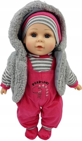Głowa, dłonie i stopy lalki wykonane są z winylu, korpus miękki wykonany z materiału. Ubranko można zdjęć i prać.