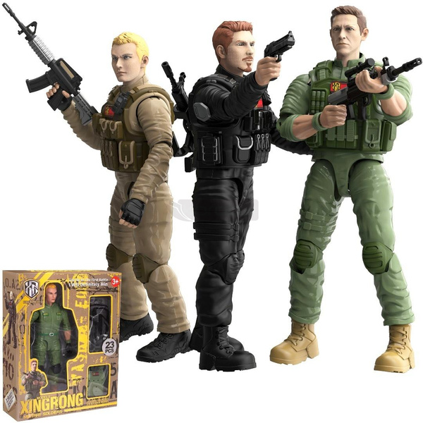 Realistyczny Wygląd i Detale: Figurki mają starannie wymodelowane twarze, a ich mundury i kamizelki taktyczne są pełne realistycznych szczegółów, takich jak kieszenie, klamry i ochraniacze. Różnią się kolorami ubioru: jeden żołnierz ubrany jest w piaskowy/beżowy mundur, drugi w czarny strój taktyczny, a trzeci w zielony mundur wojskowy.