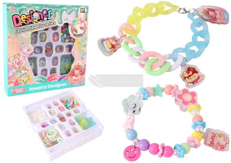 Zestaw inspirowany jest stylem sweet candy pełen jest barw, pozytywnej energii i uroku. Dziecko może wykonać zarówno delikatne, perełkowe ozdoby, jak i efektowne, łańcuchowe bransoletki z zawieszkami w kształcie tortów i babeczek. Wszystkie elementy są lekkie, przyjemne w dotyku i bezpieczne w użytkowaniu.