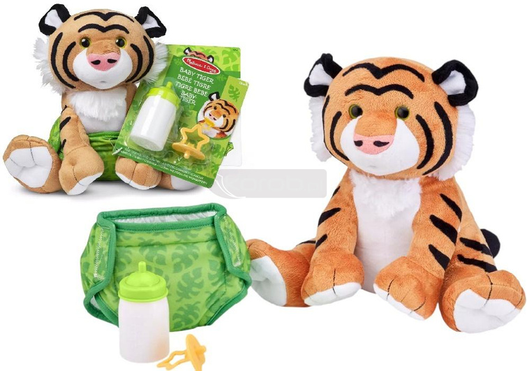 W zestawie: maskotka tygrys, butelka, smoczek, pieluszka, certyfikat adopcyjny