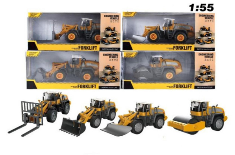 W kolekcji znajdują się cztery różne pojazdy: wózek widłowy, koparka, spychacz oraz walec drogowy - każdy z nich został wykonany w skali 1:55. Realistyczne detale, takie jak przeszklona kabina operatora, masywne opony terenowe i wiernie odwzorowane mechanizmy podnoszenia, sprawiają, że zabawa staje się pasjonującym doświadczeniem, a modele prezentują się efektownie również jako eksponaty na półce.