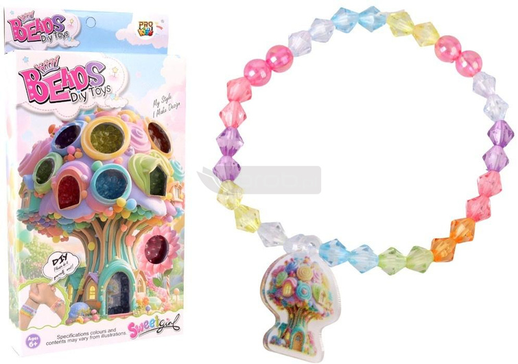W pudełku znajduje się bogaty zestaw przezroczystych, mieniących się koralików w intensywnych i pastelowych odcieniach różu, fioletu, zieleni, żółci, błękitu i pomarańczu. Dołączony elastyczny sznurek umożliwia łatwe nawlekanie i dopasowanie bransoletki do nadgarstka dziecka.