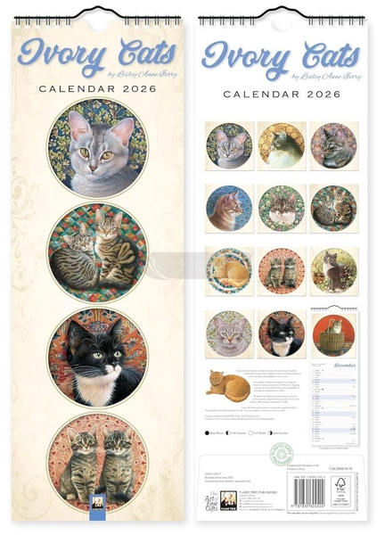 Kalendarz ścienny o wymiarach 420 145 mm, zatytułowany Koty Ivory Cats Slim Calendar 2026 (Art Calendar), wydany przez Flame Tree Publishing. Motywem przewodnim są subtelne i eleganckie obrazy kotów autorstwa Lesley Anne Ivory każdy miesiąc ilustrowany jest wyjątkową sceną z udziałem jej charakterystycznych, bogato zdobionych kotów, takich jak Twiglet, Spiro, Posky i inne.