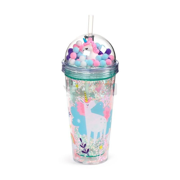 Kubek z podwójnymi ściankami, słomką i zawieszkami - Jednorożec
