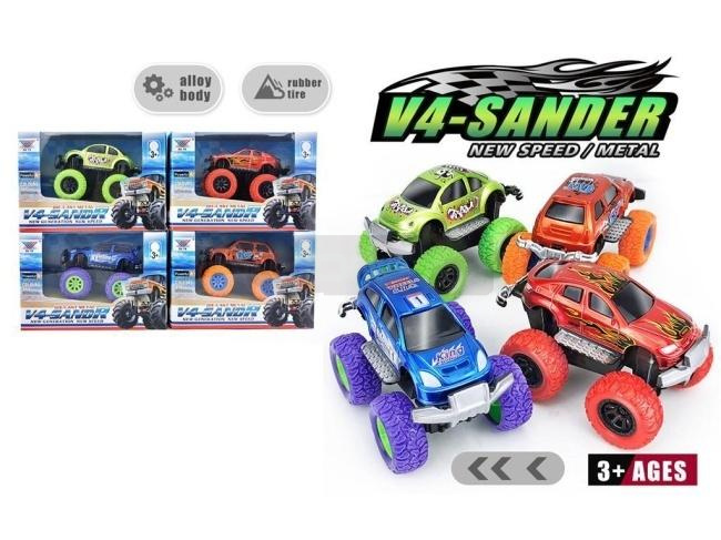 Przygotuj się na ekstremalne emocje z serią metalowych pojazdów V4-Sander. Te dynamiczne monster trucki to idealna propozycja dla każdego małego fana motoryzacji, który ceni sobie szybkość i wytrzymałość. Każdy model został precyzyjnie wykonany z dbałością o detale, łącząc w sobie agresywny, sportowy wygląd z wysoką jakością materiałów. Główną zaletą tych autek jest karoseria wykonana z trwałego stopu metali (alloy body), co sprawia, że są one znacznie bardziej odporne na uszkodzenia podczas kraks i zderzeń niż standardowe plastikowe zabawki. Pojazdy osadzone są na dużych, szerokich kołach z gumowymi oponami, które posiadają wyraźny bieżnik. Dzięki temu autka nie ślizgają się i świetnie radzą sobie podczas jazdy po podłodze czy dywanie. Mechanizm napędu frykcyjnego jest prosty i niezawodny: wystarczy pociągnąć autko do tyłu i puścić, aby zobaczyć, jak z impetem rusza do akcji. Kolorowe nadwozia ozdobione są efektownymi grafikami, takimi jak płomienie czy napisy w stylu graffiti, co dodaje im wyścigowego charakteru.