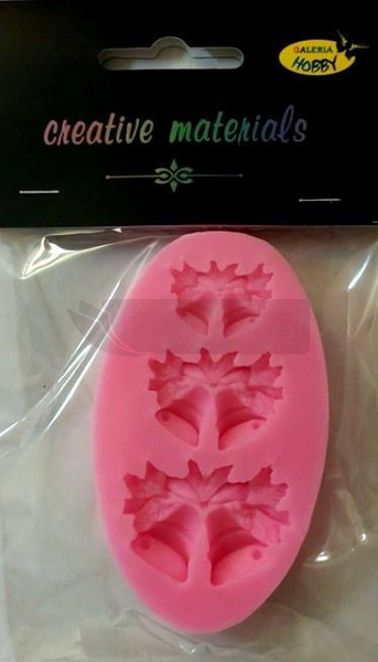 Forma silikonowa wielkości 5 cm x 8,5 cm do odlewów z gipsu, mas plastycznych, plasteliny, modeliny, mas cukierniczych itp.Z formy jest możliwość odlania lub stworzenia 3 elementów w kształcie świątecznych dzwonków z liściami ostrokrzewu.