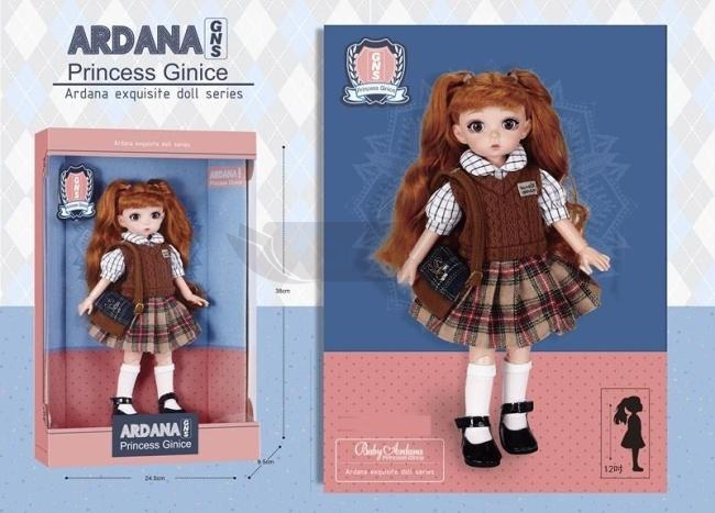 Lalka Ardana GNS Princess Ginice to prawdziwa ozdoba kolekcji Ardana Exquisite Doll Series, łącząca w sobie klasyczną elegancję z młodzieńczym wdziękiem. Lalka o imponującej wysokości 38 cm została zaprojektowana z myślą o najdrobniejszych szczegółach, co widać w jej starannie dobranej stylizacji. Princess Ginice ma na sobie modny strój przypominający elitarny mundurek szkolny, w skład którego wchodzi biała koszula z kołnierzykiem, brązowa dzianinowa kamizelka z emblematem oraz plisowana spódnica w klasyczną kratę. Całość stylizacji dopełniają białe podkolanówki, czarne buciki oraz stylowa torba przewieszona przez ramię, co nadaje jej wyjątkowego charakteru. Uwagę przykuwają również jej piękne, gęste włosy w odcieniu kasztanowym, upięte w dwa kucyki, które można czesać i układać.