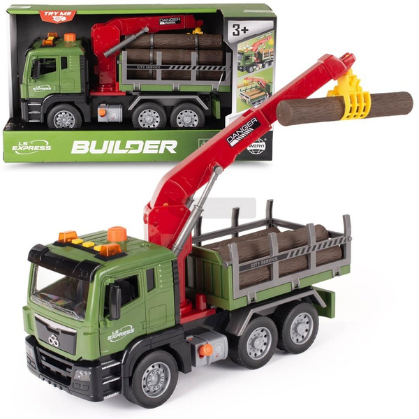 Auto Transport Drewna z Dźwigiem Builder 1:10 to interaktywna ciężarówka z ruchomym chwytakiem, światłem i dźwiękami. Napęd frykcyjny umożliwia swobodną jazdę, a solidne wykonanie zapewnia długą, bezpieczną zabawę. Doskonały prezent dla małego miłośnika pojazdów budowlanych!