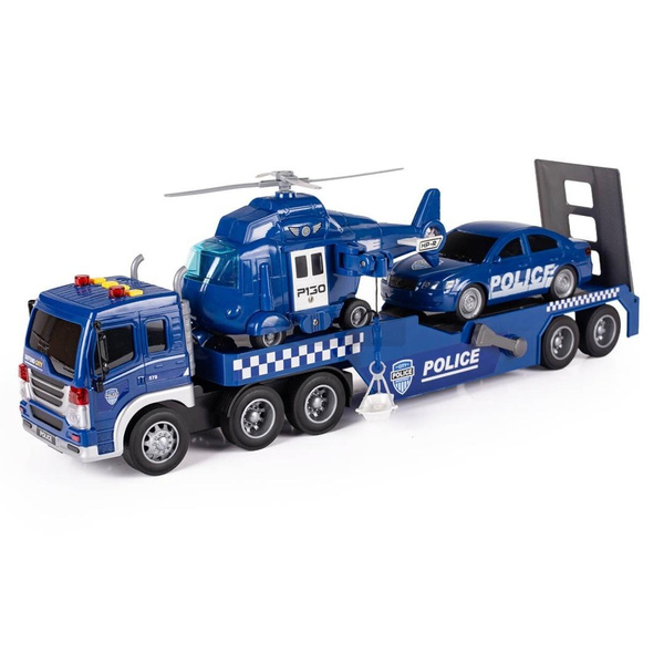 W zestawie znajduje się ciężarówka z charakterystycznymi dźwiękami, takimi jak uruchamianie silnika, sygnał dźwiękowy i dźwięk cofania. Długa rampa pozwala na łatwe załadowanie wszystkich pojazdów dołączonych do zestawu. Auto policyjne może z niej bez problemu zjechać, co rozwija zdolności manualne i wyobraźnię dziecka.