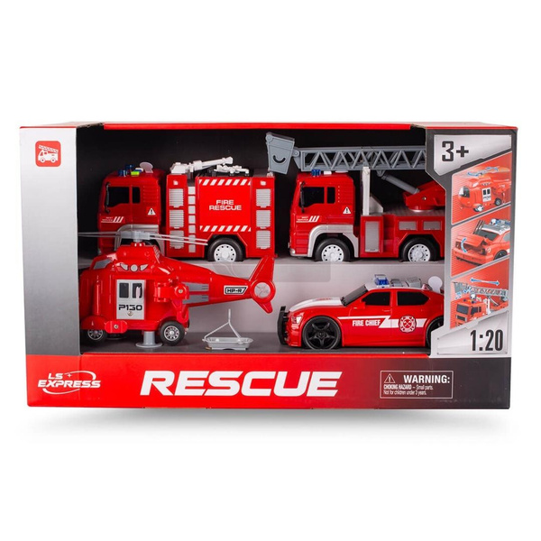 Zestaw zawiera: helikopter, wóz strażacki z drabiną, auto dowódcy, wóz strażacki z armatką