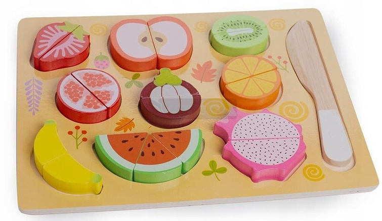 Zestaw składa się z 21 elementów, w tym wielu popularnych owoców. Każdy z nich można przeciąć nożykiem i połączyć z powrotem dzięki magnesom. W komplecie znajdują się również drewniany nożyk oraz deseczka do krojenia.