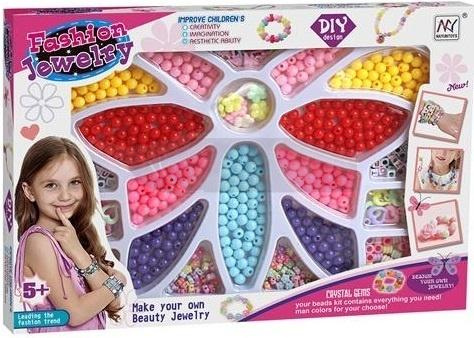 Fashion Jewelry Make your own Beauty Jewelry to fantastyczny zestaw koralików i akcesoriów, który zapewni długie godziny twórczej zabawy. Ten duży, kolorowy zestaw jest zaprojektowany, aby stymulować wyobraźnię, kreatywność i zdolności estetyczne dzieci, zgodnie z hasłem "IMPROVE CHILDREN'S CREATIVITY IMAGINATION AESTHETIC ABILITY". Wewnątrz eleganckiego opakowania znajduje się praktyczna tacka w kształcie motyla, wypełniona różnorodnymi koralikami Crystal Gems w wielu żywych kolorach, takich jak żółty, czerwony, różowy, fioletowy, niebieski i biały. Dostępne są koraliki o regularnych i nieregularnych kształtach, a także mniejsze, drobne koraliki, które można łączyć w unikalne kompozycje. Zestaw umożliwia stworzenie różnorodnej biżuterii, w tym modnych bransoletek i naszyjników. Gotowe produkty można nosić samodzielnie lub podarować jako prezent. To kompletny zestaw, który zawiera wszystko, czego potrzebuje mała artystka do rozpoczęcia swojej przygody z projektowaniem biżuterii. Produkt jest oznaczony jako odpowiedni dla dzieci od pięciu lat.