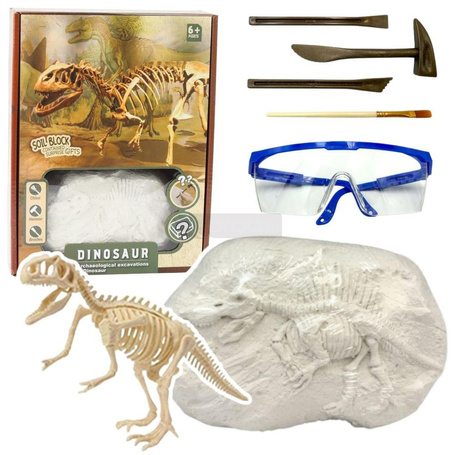Zawartość: blok gipsowy, ukryty szkielet (losowo 1 z 8), młoteczek, dłutka, pędzelek, okulary ochronne