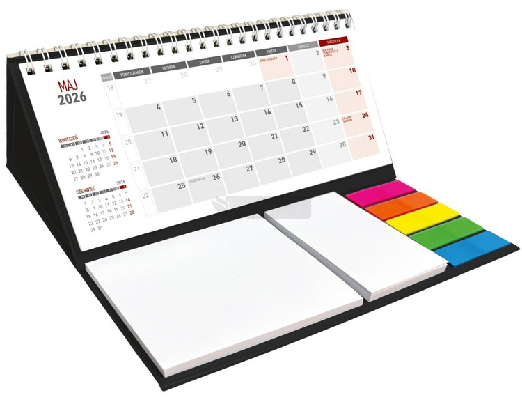Kalendarz 2026 Biurkowy z notesem czarny Praktyczny kalendarz stojący na biurko z przejrzystym kalendarium w układzie trzymiesięcznym. Poręczne samoprzylepne karteczki do notowania. Kalendarium na spirali.
