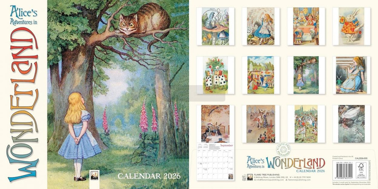 Kalendarz ścienny o wymiarach 300 300 mm, zatytułowany Alice in Wonderland Wall Calendar 2026 (Art Calendar), wydany przez Flame Tree Publishing. Motywem przewodnim są klasyczne ilustracje inspirowane ponadczasową opowieścią Lewisa Carrolla, przenoszące do niezwykłego świata pełnego absurdu, magii i nieoczywistego uroku. Obrazy wprowadzają w baśniową atmosferę Krainy Czarów, gdzie logika ustępuje fantazji, a każda scena pulsuje humorem, tajemnicą i niepowtarzalną wyobraźnią.