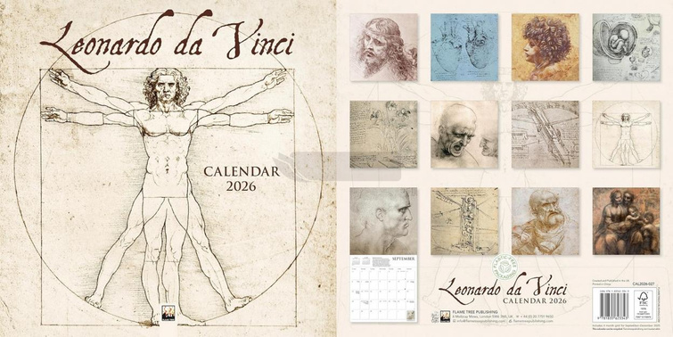Kalendarz ścienny o wymiarach 300 300 mm, zatytułowany Da Vinci Wall Calendar 2026 (Art Calendar), wydany przez Flame Tree Publishing. Motywem przewodnim są wyjątkowe reprodukcje dzieł Leonarda da Vinci, które przenoszą do świata renesansowej sztuki, pełnego geniuszu, harmonii i ponadczasowej estetyki. Każdy miesiąc zdobi osobna ilustracja przedstawiająca arcydzieła mistrza, od subtelnych portretów po precyzyjne studia anatomiczne i intrygujące projekty wynalazków.