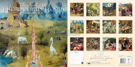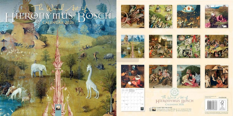 Kalendarz ścienny o wymiarach 300 300 mm, zatytułowany Hieronymus Bosch Wall Calendar 2026 (Art Calendar), wydany przez Flame Tree Publishing. Motywem przewodnim są niezwykłe, fantastyczne i pełne symbolizmu dzieła Hieronima Boscha, które przenoszą w niezwykły, oniryczny świat średniowiecznych wizji, alegorii i moralitetów pełen tajemnic, dziwacznych stworzeń i ukrytych znaczeń.
