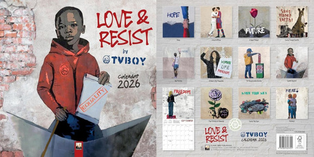 Kalendarz ścienny o wymiarach 300 300 mm, zatytułowany TVBOY: Love & Resist! Wall Calendar 2026 (Art Calendar), wydany przez Flame Tree Publishing. Motywem przewodnim są charakterystyczne, energetyczne i prowokujące ilustracje artysty ulicznego TVBOY prace pełne emocji, silnych przekazów i współczesnych kontekstów, które łączą sztukę z aktualną rzeczywistością.