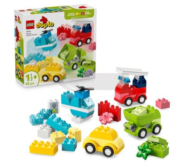 Najpierw maluchy budują główne modele z klocków DUPLO: helikopter z obracającym się wirnikiem, wywrotkę z wychylaną naczepą, wóz strażacki z drabiną na zawiasach oraz mały, rodzinny samochód. Następnie dzieci wykorzystują umiejętności motoryczne i koordynację wzrokowo-ruchową, aby rozłożyć kreatywne klocki z tych modeli i dodają dodatkowe klocki, aby stworzyć inne pojazdy LEGO. Od radiowozów po długie ciężarówki lub piętrowe autobusy maluchy mogą dać upust swojej kreatywności, łącząc klocki LEGO DUPLO w zaskakujący sposób.