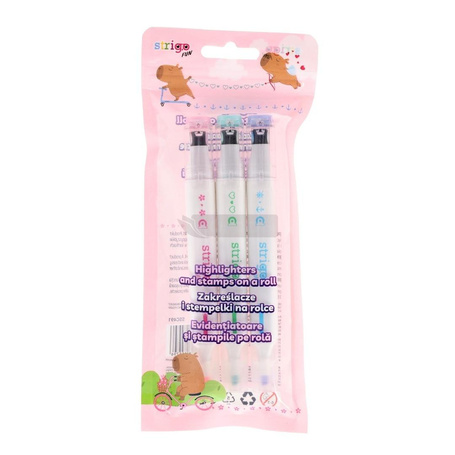 W zestawie 3 zakreslacze ze stempelkami na rolce w kolorach: niebieskim, zielonym i różowym.
