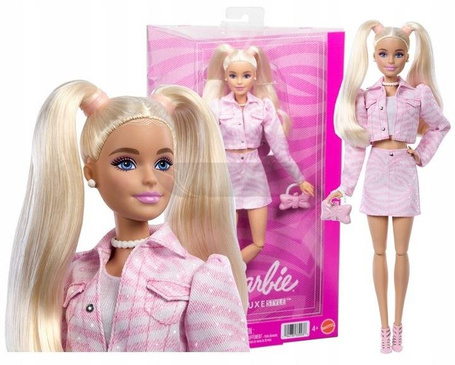 Przedstawiamy lalki Barbie Deluxe Style, które zachwycają wyjątkowym, modnym wyglądem! Każda lalka z tej linii wygląda niesamowicie i prezentuje fantastyczny styl pełen intrygujących materiałów, modnych fasonów i wspaniałych akcesoriów inspirowanych najnowszymi trendami. Zarówno dzieci, jak i dorośli kolekcjonerzy pokochają stylizowanie lalek Barbie Deluxe Style na różne fantastyczne okazje i ustawianie ich w pozach godnych najlepszych wybiegów! Ta lalka Barbie łączy dżinsową kurtkę ze spódniczką z tego samego materiału. Klapy „kieszonek” i guziki nadają jej strojowi luksusowy charakter, a wzór w jodełkę nawiązuje do pierwszej lalki Barbie z 1959 roku! Długie blond włosy lalki są upięte w dwie kitki, aby wyeksponować perełkowe kolczyki i naszyjnik. Na kostce lalka ma też perełkową bransoletkę, która idealnie podkreśla jej różowe buciki na obcasie! Lalka Barbie posiada także wyrazistą uroczą torebkę w kształcie kokardki z perełkowym paskiem. Dzięki punktom ruchu lalkę można ustawiać w różnych dynamicznych pozach z torebką! Dzieci od 4 roku życia mogą zebrać wszystkie lalki z różnorodnej linii Barbie Deluxe Style, aby rozbudzać wyobraźnię do zabawy modą i wyrażania własnego stylu.