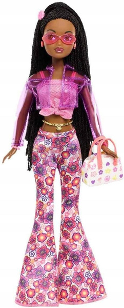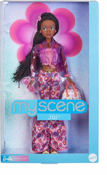Moje miasto. Mój styl. My Scene! Lalki My Scene powracają, upamiętniając trendsetterki, które potrafiły zamienić każdą okazję w pokaz mody! Lalka Barbie My Scene Jai wygląda zjawiskowo w różu i fiolecie! Jej wiązany krótki top z połyskiem i spodnie-dzwony z motywem hibiskusa emanują pozytywną energią w stylu Y2K. Swój kwiecisty strój zestawia z przezroczystą winylową kurtką. Dodatki, takie jak kolorowe okulary przeciwsłoneczne, złocisty łańcuszek na brzuch, bransoletki i urocza torebka, sprawiają, że jej strój nabiera jeszcze modniejszego charakteru! Długie czarne warkoczyki i kolczyki podkreślają jej doskonały wygląd. Dzięki niezwykle uroczemu ozdobnemu opakowaniu lalka My Scene Jai przyciąga wzrok jeszcze mocniej! Zbierz całą ekipę trendsetterek! Te uwielbiające maksymalistyczny styl przyjaciółki tworzą razem kolekcję idealną zarówno dla fanów My Scene, jak i kolekcjonerów Barbie.