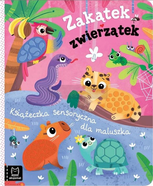 Książeczka sensoryczna z silikonowymi wstawkami i rymowanką to świetny sposób na poznawanie świata i stymulowanie zmysłów maluszka. Z tą książeczką dziecko poznaje zwierzątka z dżungli oraz ich rodziny. Uczy się zasad koleżeństwa i przyjaźni. Dotykając silikonowych wstawek, dziecko bawi się książeczką i ćwiczy spostrzegawczość oraz liczy w zakresie pięciu. Silikonowe wstawki w książeczce mają różnorodne faktury i wzory, a ilustracje sympatycznych zwierzątek urzekają stylem i kolorami. Bohaterowie książeczki z silikonowymi wstawkami to: papuga, wąż, pantera, żółw i kapibara.