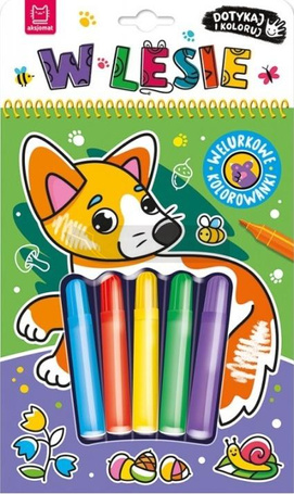 Dotykaj i koloruj. W lesie to kolorowanka sensoryczna z dołączonymi pisakami. Tło obrazków pokrywa czarny welur, który podkreśla głębię kolorów, zapewnia wrażenia sensoryczne i ogranicza wychodzenie poza linię. Małych fanów i fanki zwierząt czeka spotkanie z mieszkańcami lasu. W gronie leśnych zwierząt w książce znajdują się: borsuk, dzik i sowa, bobry, niedźwiedź, jeleń, wilk i nietoperze, wiewiórki, zajączek. Dzieci nie tylko pokolorują 8 uroczych rysunków. Przeczytają również wierszyki o zwierzętach z ilustracji. A dzięki perforacji pokolorowaną pracę mogą oderwać, włożyć do ramki i podarować w prezencie lub ozdobić nią pokój.