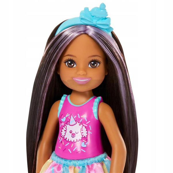Ta mała lalka Chelsea ma ciemnobrązowe włosy z fioletowymi pasemkami, imprezową stylizację i 4 akcesoria tematyczne. A solenizantom życzy wszystkiego najlepszego!