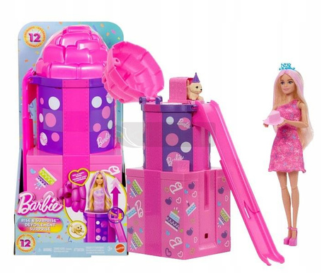 Zestaw Barbie Party Unboxed Urodzinowa niespodzianka ze zjeżdżalnią i lalką schowaną w opakowaniu inspirowanym pudełkiem na prezent zapewnia niezapomniane wrażenia z rozpakowywania oraz zabawę w urodzinowe przyjęcie dla zwierzątka!